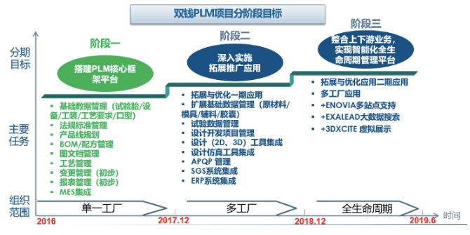 鉴于双钱公司涉及集团——技术中心——多工厂的集中统筹管理模式,结合双钱公司现有技术状况对整个产品生命周期管理系统的实施内容和目标进行分解成三个阶段:第一阶段以产品数据管理为主加以泰国公司的MES和ERP系统集成;第二阶段增加项目管理和图纸集成管理,并推广其他公司;第三阶段在前两阶段增加大数据分析和应用深化拓展。